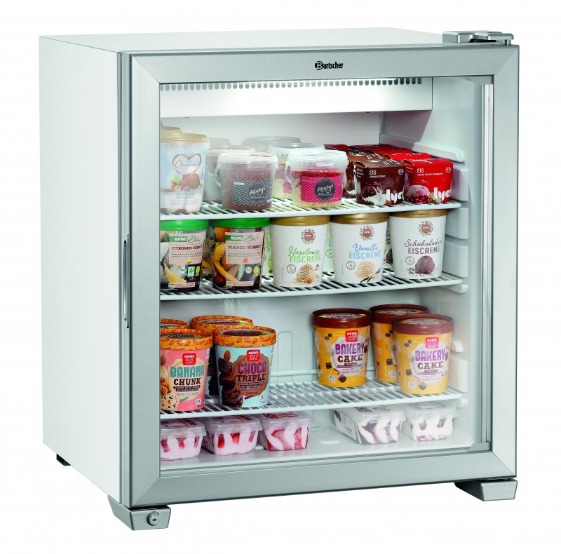 Diepvrieskast met een inhoud van 90 liter met glazen deur en afzonderlijk schakelbare raamverwarming. Ideaal voor een perfecte presentatie van diepvriesproducten zoals ijs in kiosken, bioscopen, benzinestations, bistro's of bars.