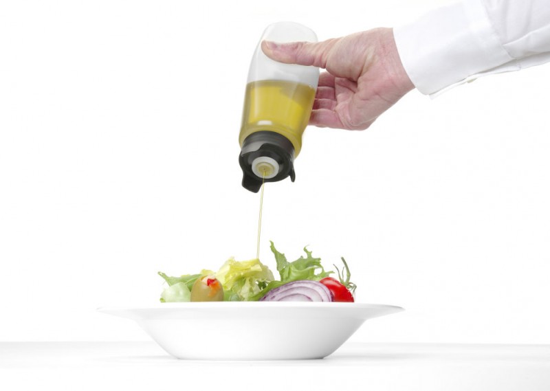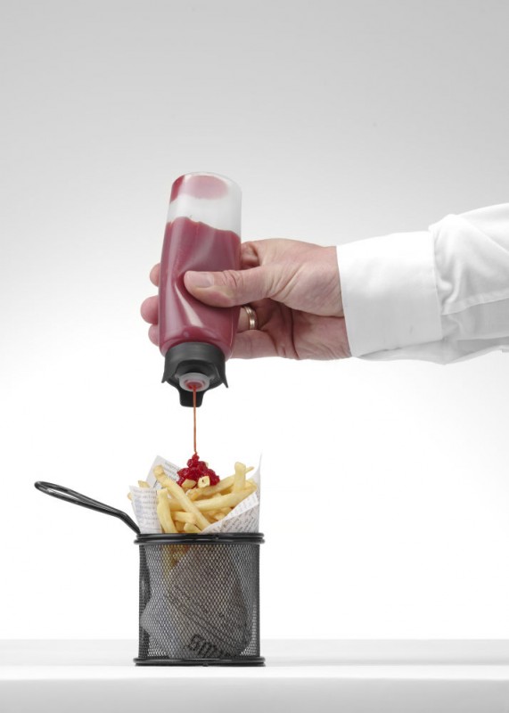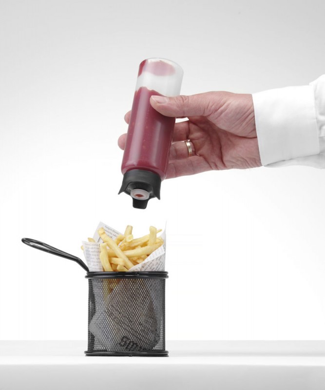 Ontworpen door Robert Bronwasser. Transparante fles met speciaal ontworpen doseerdop. De fles kan ondersteboven worden geplaatst waardoor hij altijd klaar is voor gebruik. Het speciale ontwerp voorkomt lekken bij plaatsing ondersteboven.