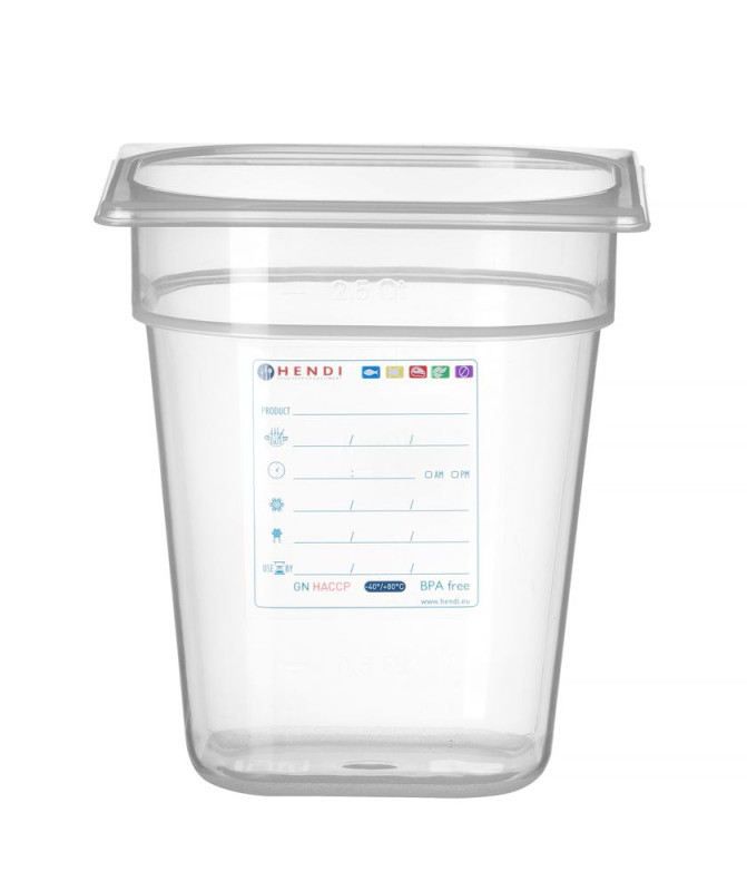 Gastronorm bakken los - deksels niet inbegrepen. Luchtdicht afsluitbaar. Smaak- en reukvrij. Deksels en deksel clips (groen, geel, blauw, rood of paars volgens HACCP normen) los verkrijgbaar. Met slijtvast etiket voor voedsel opslag registratie. Speciale horecastiften niet inbegrepen.