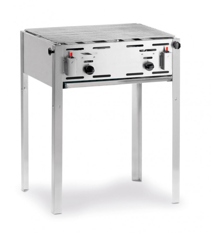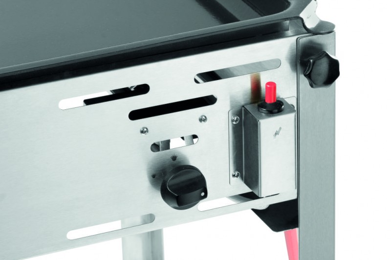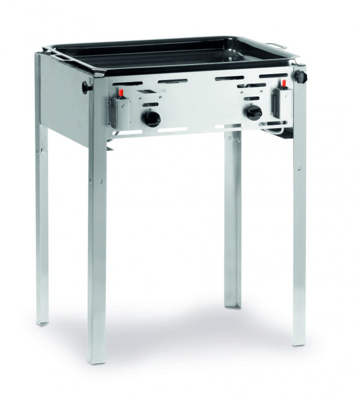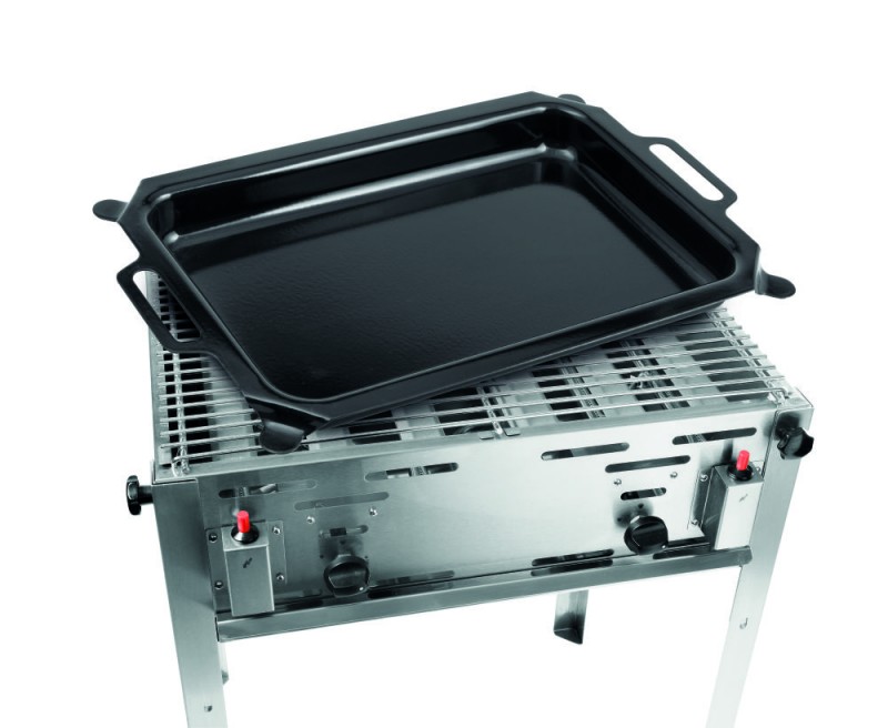 Frame gemaakt van 18/0 roestvast staal. Met verchroomd rooster en geëmailleerde braadpan. Binnenmaat braadpan 590x480 mm. Elektronische ontsteking en thermokoppel. Inclusief gasslang en drukregelaar. Geschikt voor propaan- of butaangas. Verbruik 0,430 m³/u.