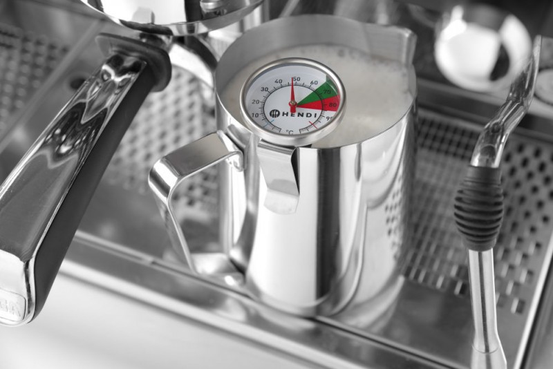 Met clip om de thermometer te bevestigen aan de melkkan. Groene markering voor de ideale melktemperatuur voor cappuccino etc. Temperatuurbereik -10 tot 110°C. Schaalverdeling 1°C. Sonde van roestvast staal met beschermhuls. Gemakkelijk af te lezen.