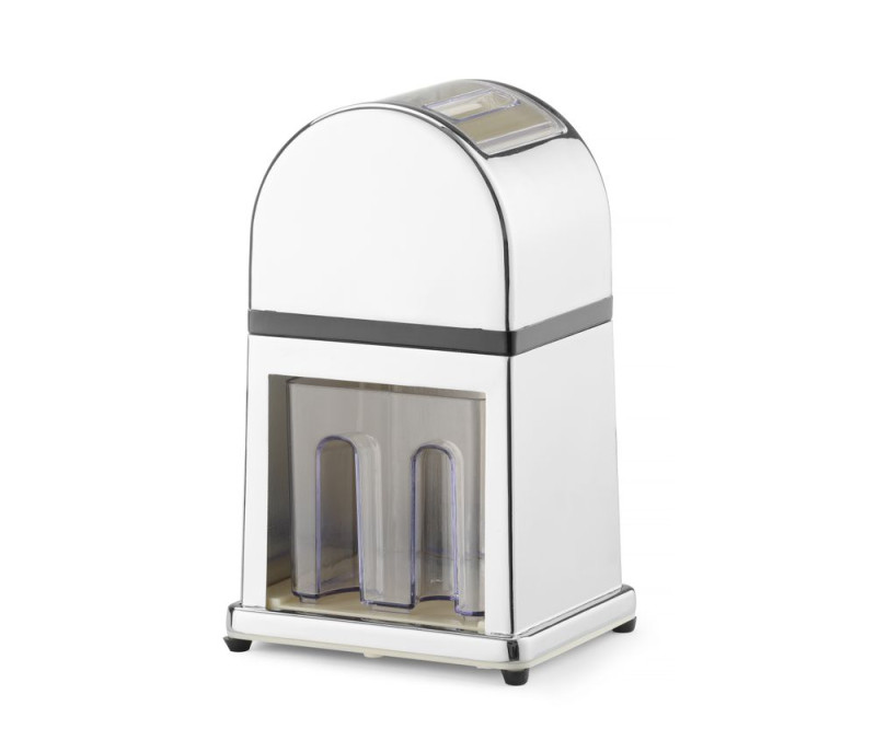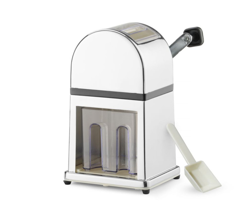 Verchroomde zink legering met roestvast stalen messen. Inclusief kunststof ijs schepje. Met uitneembare ijs container.