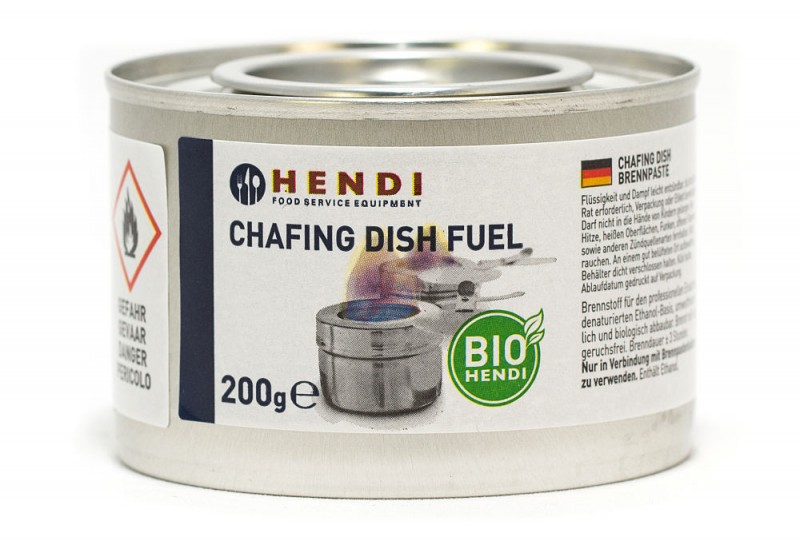 200 grams blikje voor chafing dish. Brandduur: ≈ 3 uur.
