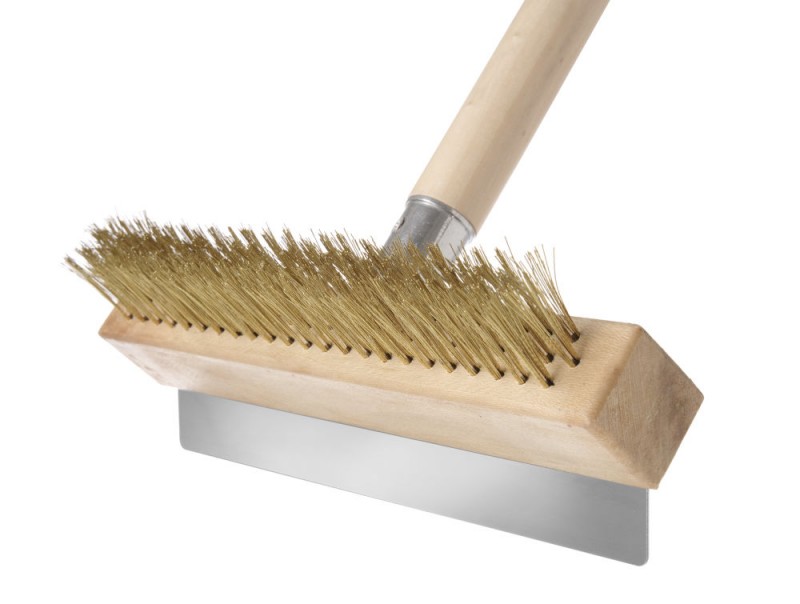 Borstel gemaakt van messingdraad. Demontabele houten houder met schroefdraad. Met stalen schraper.