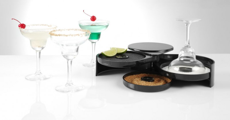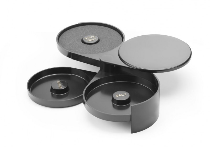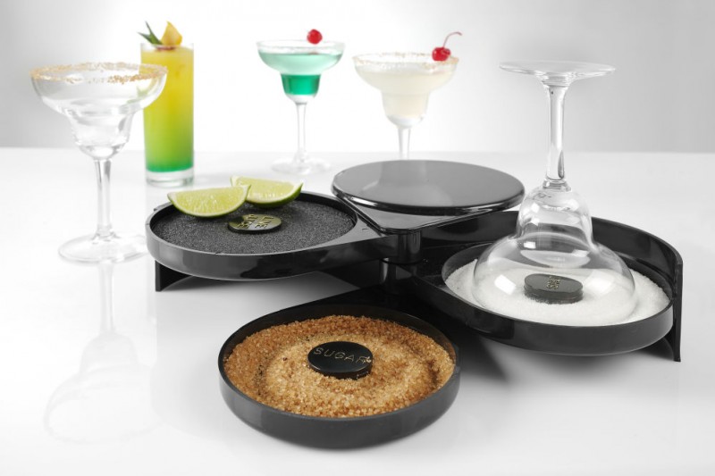 Voor het verfraaien van de randen van glazen. Drie lagen voor limoensap, zout en suiker. Met spons voor het limoensap om morsen te voorkomen.