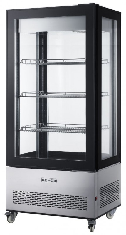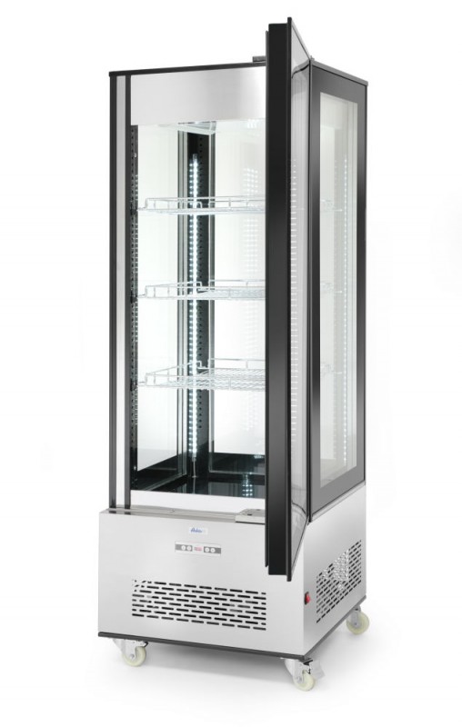 Behuizing van roestvast staal met driedubbele beglazing. Geforceerde luchtkoeling met automatische ontdooiing, compressor geplaatst onder de koelruimte. Voorzien van 3 verstelbare verchroomde planken. Heldere LED-verlichting in de 4 palen. Voorzien van 4 zwenkwielen waarvan 2 met remmen. Digitale temperatuurregelaar en display, met aan/uit-schakelaar. Temperatuurbereik: 2˚/6˚C. Klimaatklasse: 4 Koelmiddel: R290.