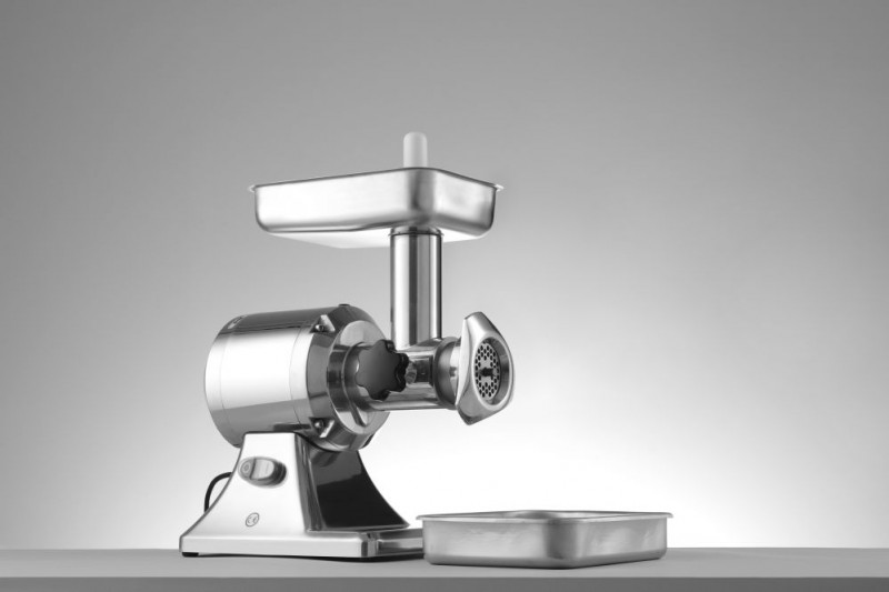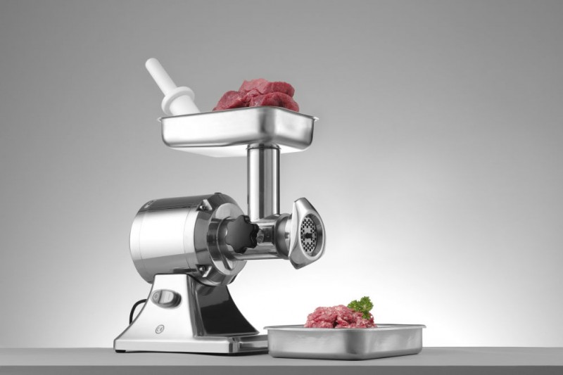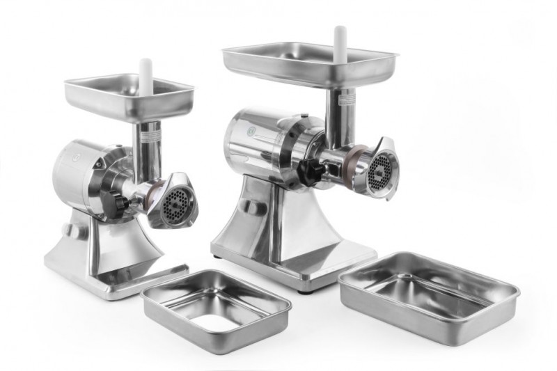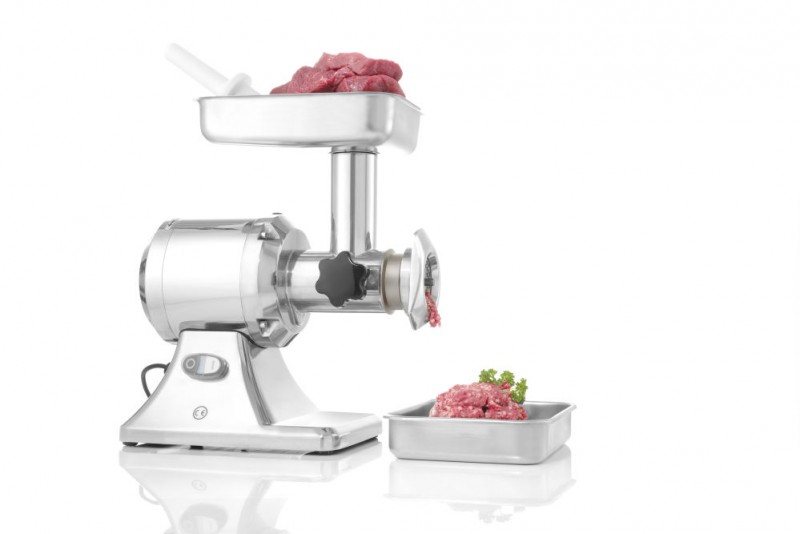 Hoogwaardige apparatuur voor het vermalen van alle soorten vlees zonder huid of botten. Wormschroef van een hoogwaardige aluminium legering. Behuizing, aandrijfas en vleescontainers gemaakt van roestvast staal. Inclusief polyethyleen stamper. Stille in olie gedompelde transmissie. Geperforeerde plaat Ø70 mm met Ø 6 mm gaten. Niet geschikt voor continu gebruik. Gewicht 19 kg. Capaciteit 200 kg/u.