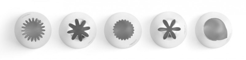 Set bestaat uit 5 spuitmondjes voor decoratie: - 2x closed Star - 1x drop Flower - 1x french Star - 1x v-shaped. Extra nauwkeurig dankzij scherpe randen.