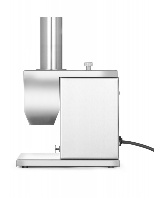 Elektrische worstensnijder met dubbel mes en regelbare snijdikte. Extra lange invoer schacht voor allerlei soorten worst. Maximum diameter van 48 mm.