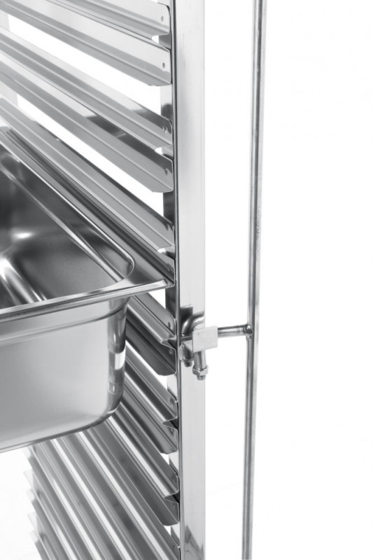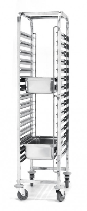 GN 1/1 met 15 etages - tussenruimte 80 mm. Met aan beide zijden een vergrendeling voor de plateau’s. Voorzien van 4 zwenkwielen waarvan 2 geremd. Wordt gedemonteerd geleverd.