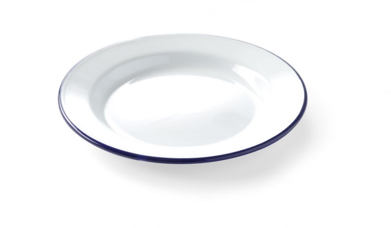 Gemaakt van staal, geëmailleerd in wit met een blauwe rand.