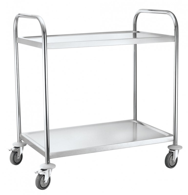Gemaakt van roestvast staal. Voorzien van 2 bladen met geluiddempend materiaal aan onderzijde blad. Maximale belasting per blad 50 kg. Met 4 zwenkwielen, waarvan 2 geremd, voorzien van hoekbeschermers. Afstand tussen de bladen 550 mm. Werkblad 830x510. Flatpack levering.
