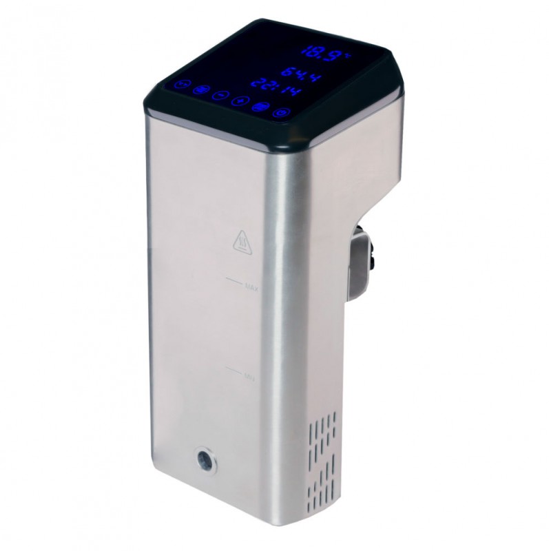 Hoge precisie sous vide thermische circulatie stick met temperatuurregeling 4 inch touchscreen interface. Ontworpen om op elk rond of plat kookvat te passen met een minimale diepte van 16,5 cm, door middel van een klem. Beste prestaties tot 80 liter. Werktemperatuur 5°C tot 99°C, nauwkeurigheid 0,07°C. Meerdere machines kunnen worden beheerd vanuit de app. Biedt uitzonderlijke temperatuurstabiliteit. Lage waterstand bescherming, apparaat schakelt de Sous Vide uit in geval van gebruik zonder water Circulatiepomp om koude en hete plekken te elimineren. Temperatuursensor om overbelasting en oververhitting te voorkomen. IPX7 is bestand tegen spatten en onbedoelde onderdompeling. App: Nauwkeurige temperatuurregeling vanaf elke plek. Een verzameling van meer dan 600 recepten. Onze Sous Vide-calculator: we hebben alle testen en onderzoeken voor u gedaan, wat betekent dat u niet meer op internet hoeft te zoeken naar informatie. Receptgeheugen: bewaar uw eigen tijden en temperaturen. Cook geschiedenis: voor een betere HACCP controle bewaart u, uw laatste 10 gerechten en temperaturen. Koken met meerdere apparaten: Beheer meerdere apparaten vanaf één app. Meldingen om te bevestigen wanneer het water op temperatuur is en het voedsel gaar is. De kooktijd is voltooid, maar maak je geen zorgen, de app houdt het eten op de optimale temperatuur.
