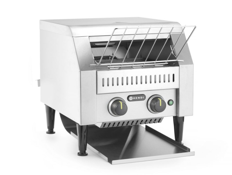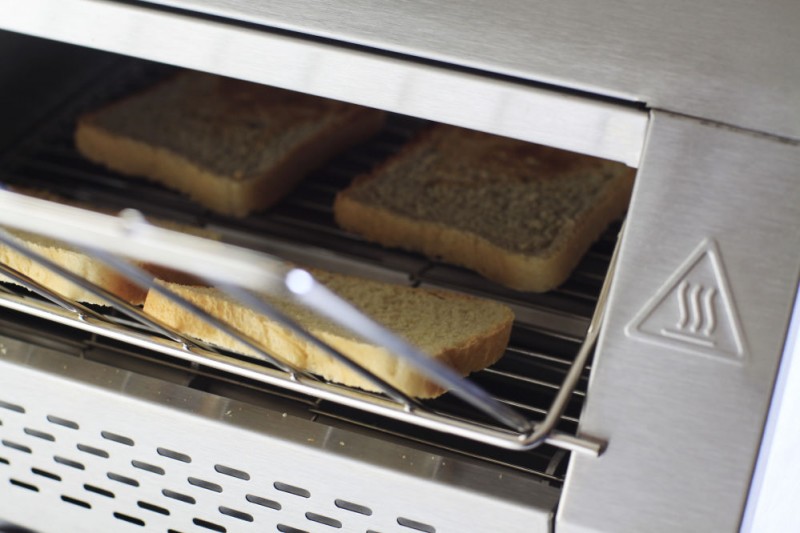 Twee rijen sneetjes passen naast elkaar op de loopband. Voorzien van twee aparte elementen. Geschikt voor het doorlopend roosteren van sneetjes brood. Met opvangbak voor en achteren. Instelbare doorlooptijd tot 3 minuten.