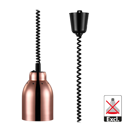 koper, met hoogte instelbaar snoer max 180cm, voorzien van schakelaar, geeft onmiddellijk directe hitte, verschaft een doordringende warmte zonder dat het oppervlakte van saus of jus stolt, eenvoudig te installeren, wordt zonder infrarood lamp geleverd