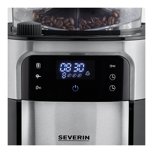 filterkoffiemachine met geïntegreerd roestvrijstalen maalwerk, door de fijne maling en de individueel in te stellen maalgraad kan deze volledig afgestemd worden op de eigen smaak. Het apparaat is voorzien van LED bedieningspaneel met timerfunctie. 3 aromastanden, maalwerk uitschakelfunctie voor de bereiding van voorgemalen koffie, instelbare maalgraad en koffie hoeveelheid