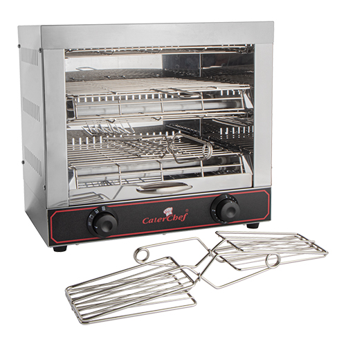 de quartzbuizen kunnen onder en boven afzonderlijk bedient worden en daardoor is het tosti apparaat ook zeer geschikt voor o.a. gratineren en grillen, dit wordt nog eenvoudiger gemaakt door de opklapbare achterzijde, het apparaat is voorzien van een tijdklok en lekbak