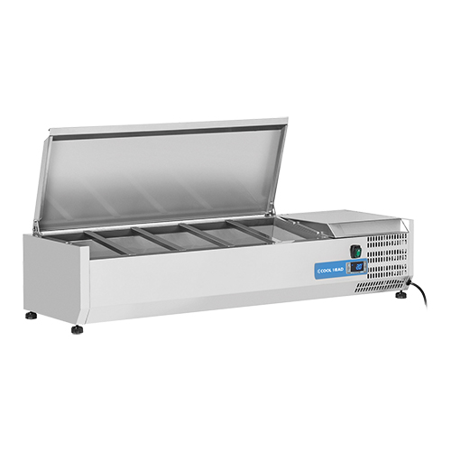GN maatvoering voor max. 15cm diep, roestvrijstaal, thermostatisch regelbaar +2°C/+8°C, verlichte hoofdschakelaar, wordt zonder GN bakken geleverd, met roestvrijstalen klapdeksel