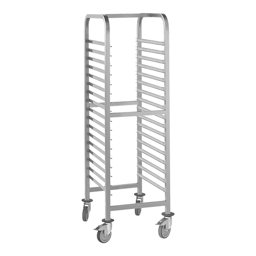 extra zware gelaste roestvrijstalen uitvoering met 17 regalen 1/1GN, voorzien van 4 zwenkwielen waarvan 2 geremd