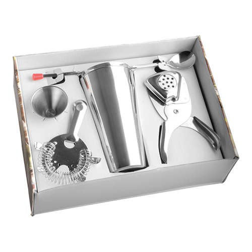 met deze set kunt u direct aan de slag als een ware bar tender, de set omvat een barmaatje, cocktail strainer, citroenknijper, bar lepel en een shaker om de cocktails te kunnen shaken
