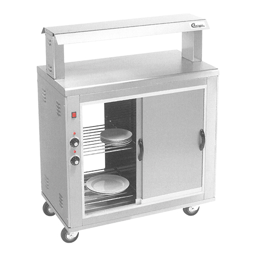 Voorzien van 4 zware zwenkwielen, twee roosters, op wieltjes lopende schuifdeuren aan beide zijden en goed afgeschermde quartz buizen die instelbaar zijn d.m.v. warmteregelaars. Capaciteit 120 borden. Met onafhankelijk regelbare warmtebrug. Doorgeefruimte brug-bovenkast 20cm