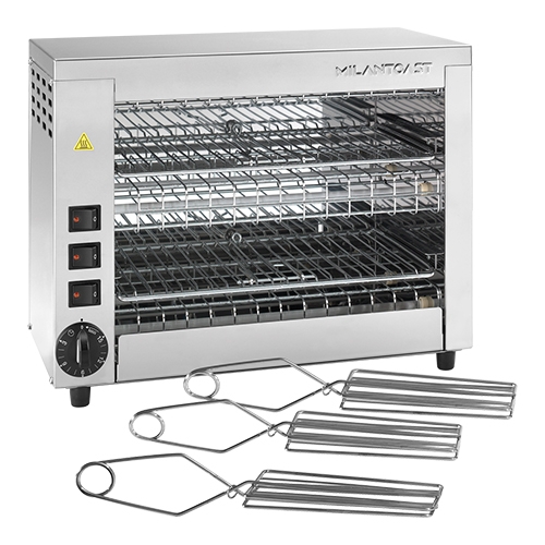 de quartzbuizen kunnen onder en boven afzonderlijk bedient worden en daardoor is het tosti apparaat ook zeer geschikt voor o.a. gratineren en grillen, dit wordt nog eenvoudiger gemaakt door de opklapbare achterzijde, het apparaat is voorzien van een tijdklok en lekbak