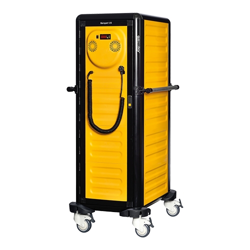 voor banket of catering, maakt het mogelijk de keuken naar de gast te brengen. Een gegarandeerde levering van uw gerechten op een temperatuur boven de 65°C, door de uitstekende isolatie wordt de gewenste temperatuur snel bereikt en langer vastgehouden. De warmhoudwagen is vervaardigd van dubbelwandig hoogwaardig ABS en beschikt over een metaal geëpoxeerd frame. De warmhoudwagen is voorzien van duwbeugel, 4 zwenkwielen waarvan 2 geremd, spiraalsnoer en regelbare digitale thermostaat van 65°C tot 90°C graden. Uitvoering voor 1/1 gastronorm plateaus of bakken