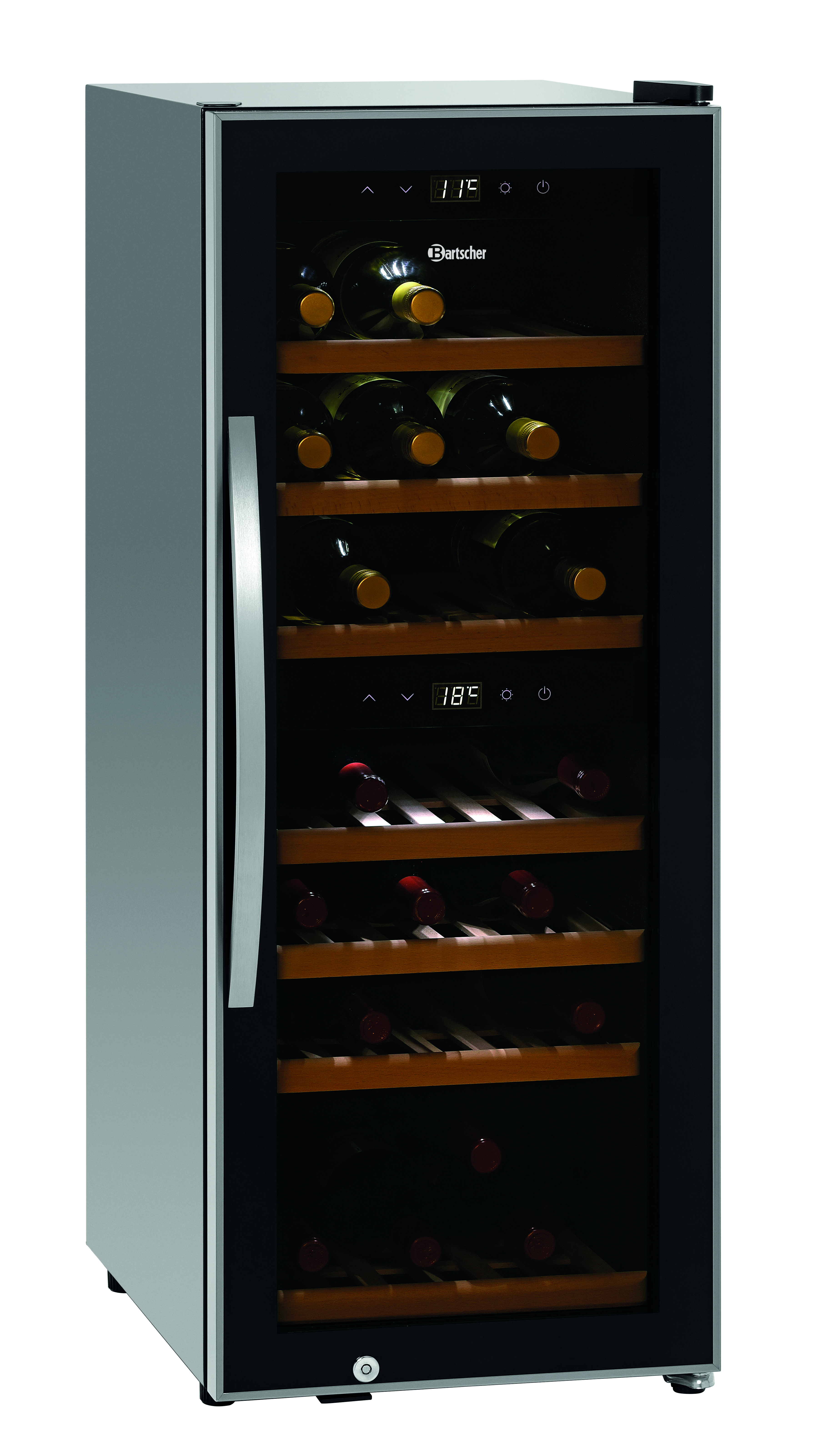 De hoogwaardige wijnkoelkast met haar stijlvolle, elegante design en de geluidloze compressor is voorbestemd voor de inzet in bar- en restaurantbereik. De twee afzonderlijk regelbare temperatuurzones alsook de ruit met UV-filter garanderen een optimale opslag en presentatie van rode en witte wijn.