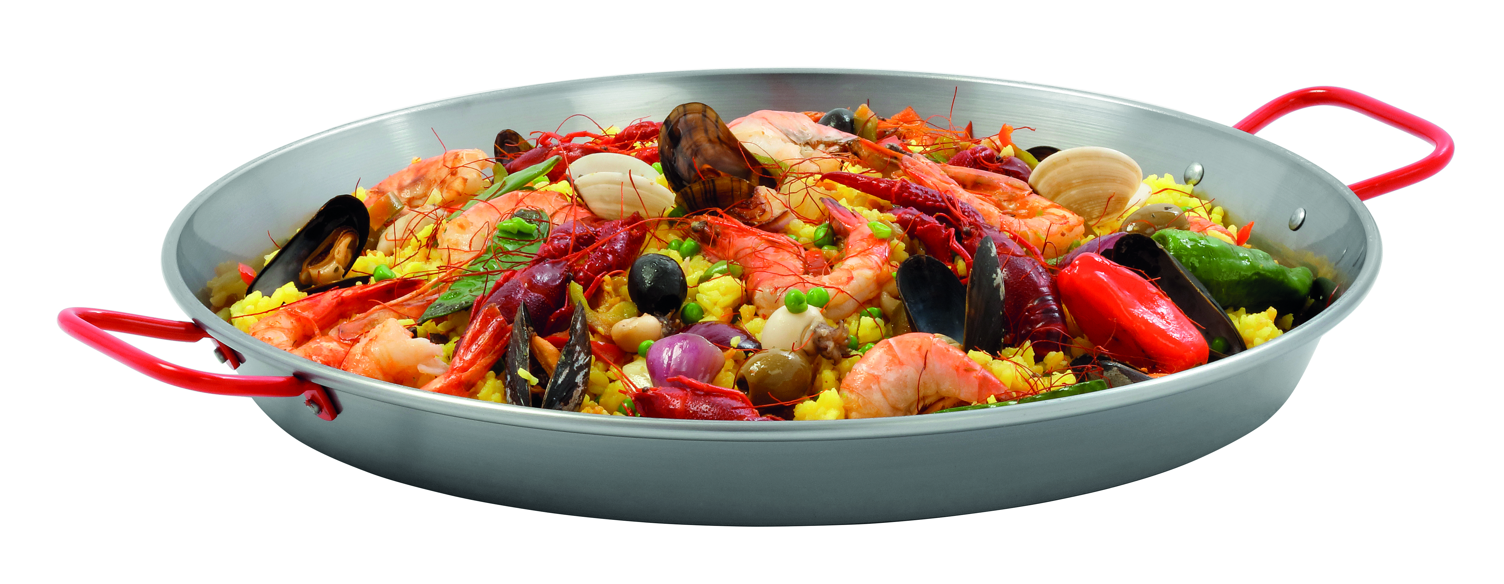 Robuust, vollediggepolijst staal, gestructureerd kookoppervlak met hoge rand, hittebestendige grepen - Bartscher paella-pannen zijn ook uitermate geschikt voor de bereiding van gebakken aardappelen, gesneden vlees, gyros of chilli con carne.