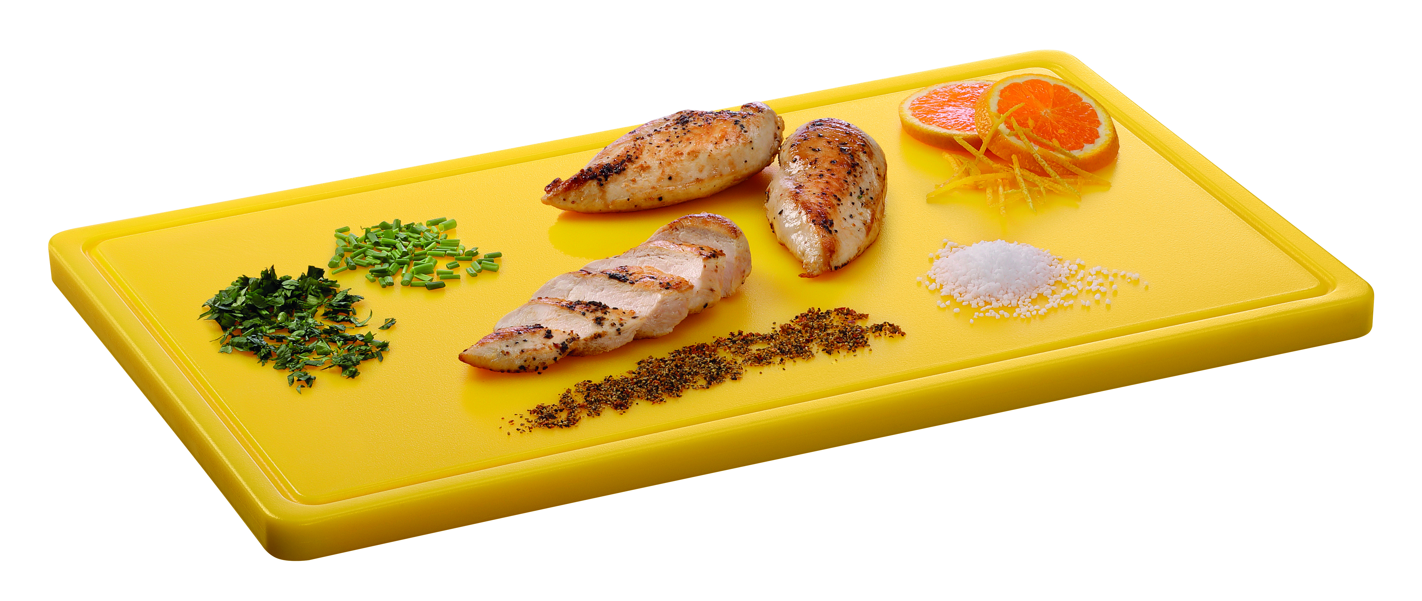 Hygiëne in focus met de snijplanken uit de serie PRO - verschillend gekleurde snijplanken voor verschillende voedingsgroepen. De HACCP-conforme gele snijplank is ontworpen voor het snijden van gevogelte.
