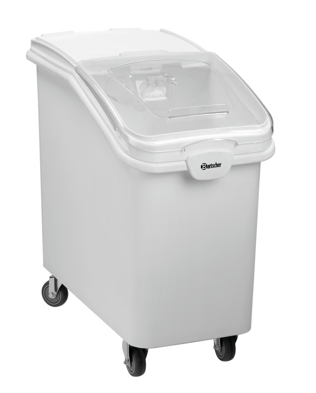 Mobiele, robuuste voorraadcontainer voor een hygiënische bevoorrading van verschillende graansoorten en van specerijen, rijst of noedels. Het transparante deksel maakt een snel overzicht mogelijk van welke droge goederen zich in de container bevinden.