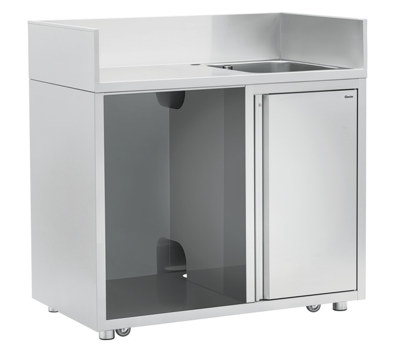 Netheid op elke plaats: het mobiele spoelcentrum verandert dankzij zwenkwielen en in hoogte verstelbare voeten in een handomdraai van een mobiel naar een stabiel hygiënestation. Met een uitsparing voor een vaatwasser, wasbak en afdruipvlak een schone zaak.