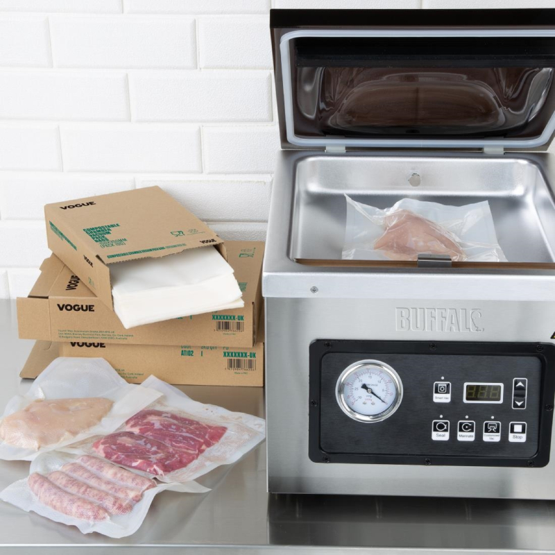 Bewaar en conserveer voedsel langer met de 250x350mm Vogue composteerbare kamer vacuumverpakkingszakken. Zeer duurzaam en gemakkelijk te gebruiken, zijn de zakken een essentiële toevoeging aan elke professionele keuken, die efficiënte, hygiënische opslag bieden en helpen om de opslagduur met maximaal 3-5 dagen te verlengen. Geschikt voor opslag in vriezers, koelkasten en koelruimtes, zijn deze betrouwbare zakken ook geweldig om het volume van voedsel te verminderen, waardoor meer items kunnen worden opgeslagen in vergelijking met volumineuze dozen of niet-afdichtbare zakken. De Vogue-zakken zijn geschikt voor koken, magnetron en sous vide, waardoor ze een uitstekende keuze zijn voor het snel opwarmen van gerechten of het bereiken van fantastische texturen en smaken. Wanneer gebruikt in combinatie met een geschikte vacuümmachine (apart verkocht), worden de zakken luchtdicht afgesloten, wat helpt om de smaak van uw gekruide ingrediënten te behouden en zelfs te verbeteren. En eenmaal gebruikt, zijn deze zakken ook composteerbaar, wat betekent dat er een verminderde milieu-impact is.